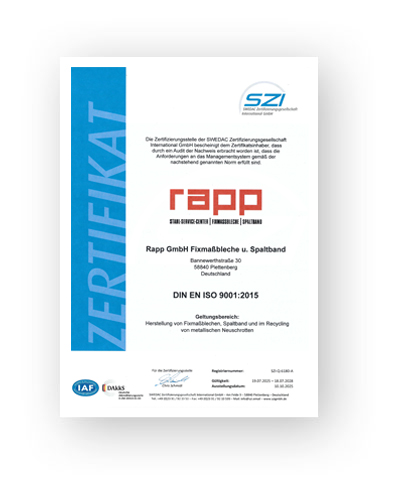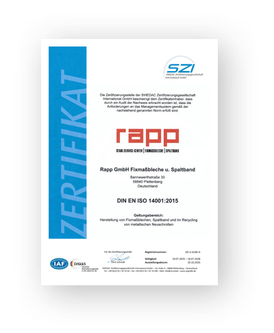 | RAPP Stahl is certified according to DIN EN ISO 9001, DIN EN ISO 14001 and is a waste management company. | |
